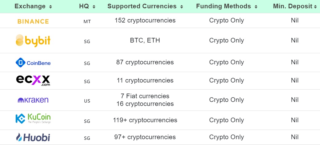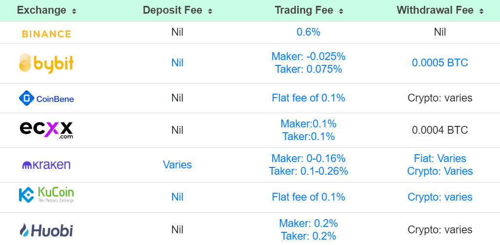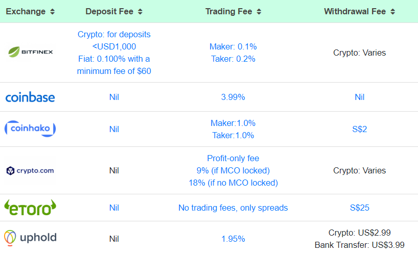 Here’s a snapshop of the fees charged by the fiat-to-crypto and crypto-only exchanges featured above. Crypto-only exchanges generally have more competitive trading fees than fiat-to-crypto exchanges.